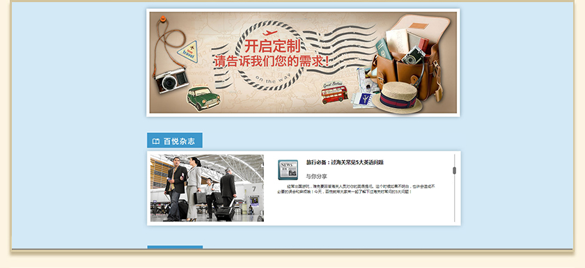 Project Description 百悦逸游于2012年初由二位资深的旅行家创办,是成都传媒集团旗下成都新闻国际旅行社有限公司的高端旅游品牌,总部位于成都高新区天府大道中段美年广场。在百悦逸游成立之前,创始团队亲自到全球三十多个国家实地考察,带着第一手的资讯和执着的信念创立了中国西部第一家真正意义上的私人定制旅行机构。百悦的旅行不是跟团挤大巴,不是十天去十个国家,更不是没完没了的... Official website address 陇南http://www.100.travel I want to share